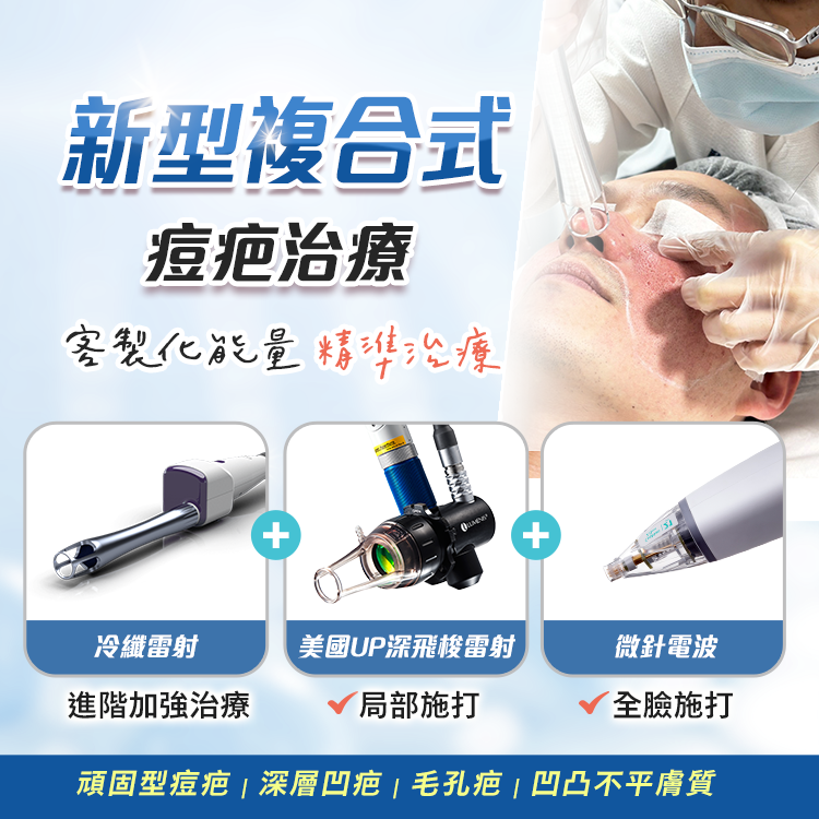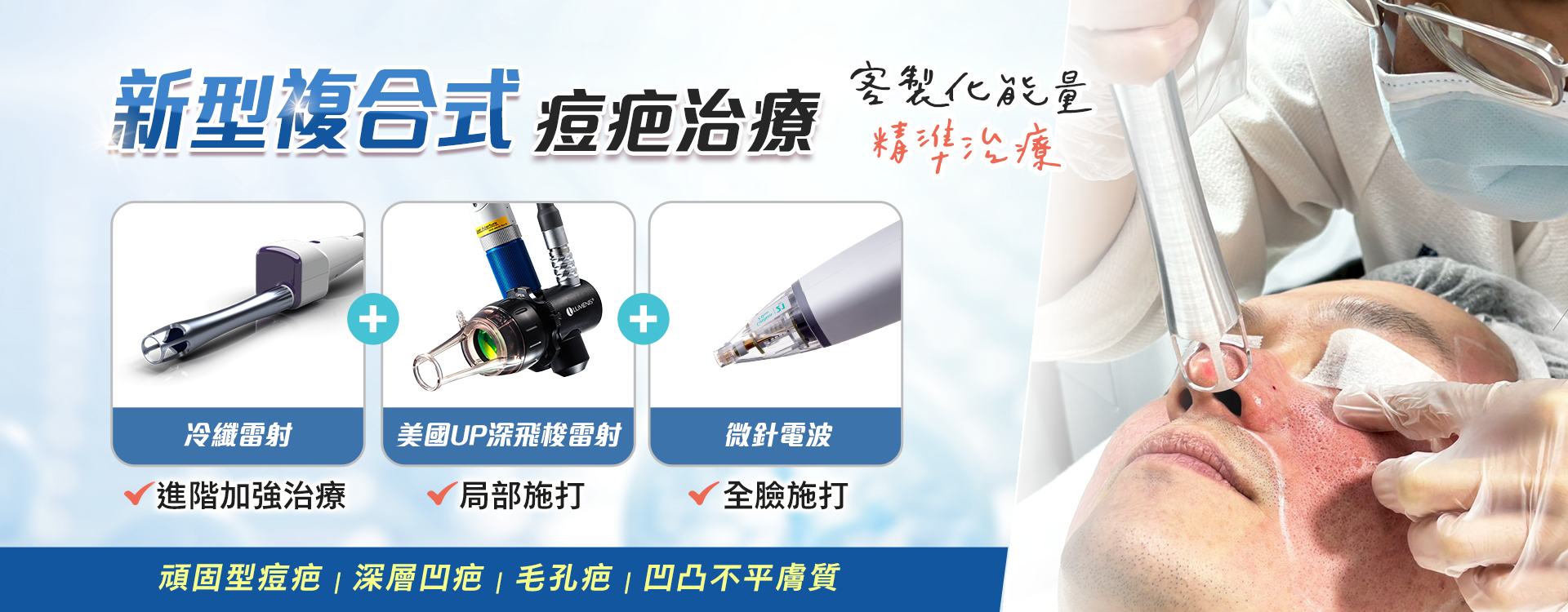 複合式痘疤治療治療關鍵在於對的深度及位置,給予精準足夠的能量,提高治療痘疤滿意度並有效縮短痘疤雷射恢復期。